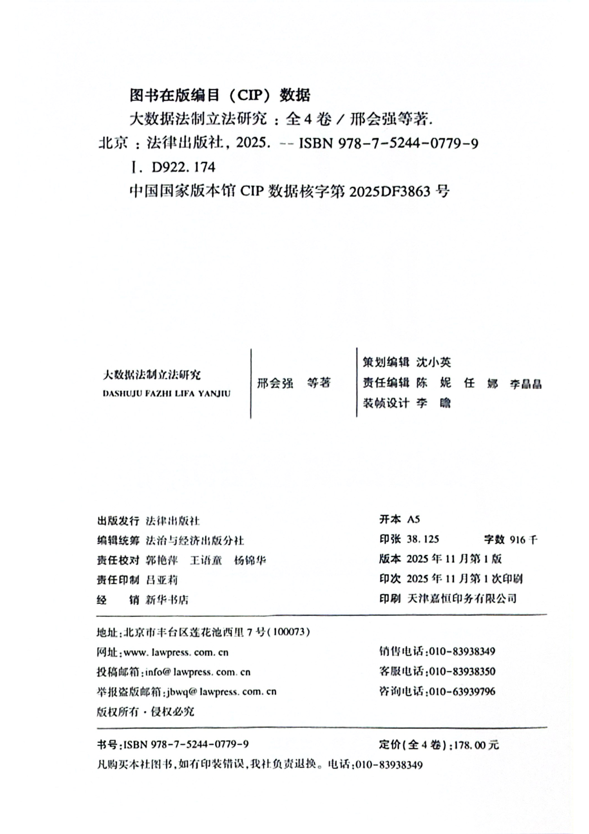 日前,由中央财经大学法学院教授邢会强等著的《大数据法制立法研究》四卷本在法律出版社出版发行。