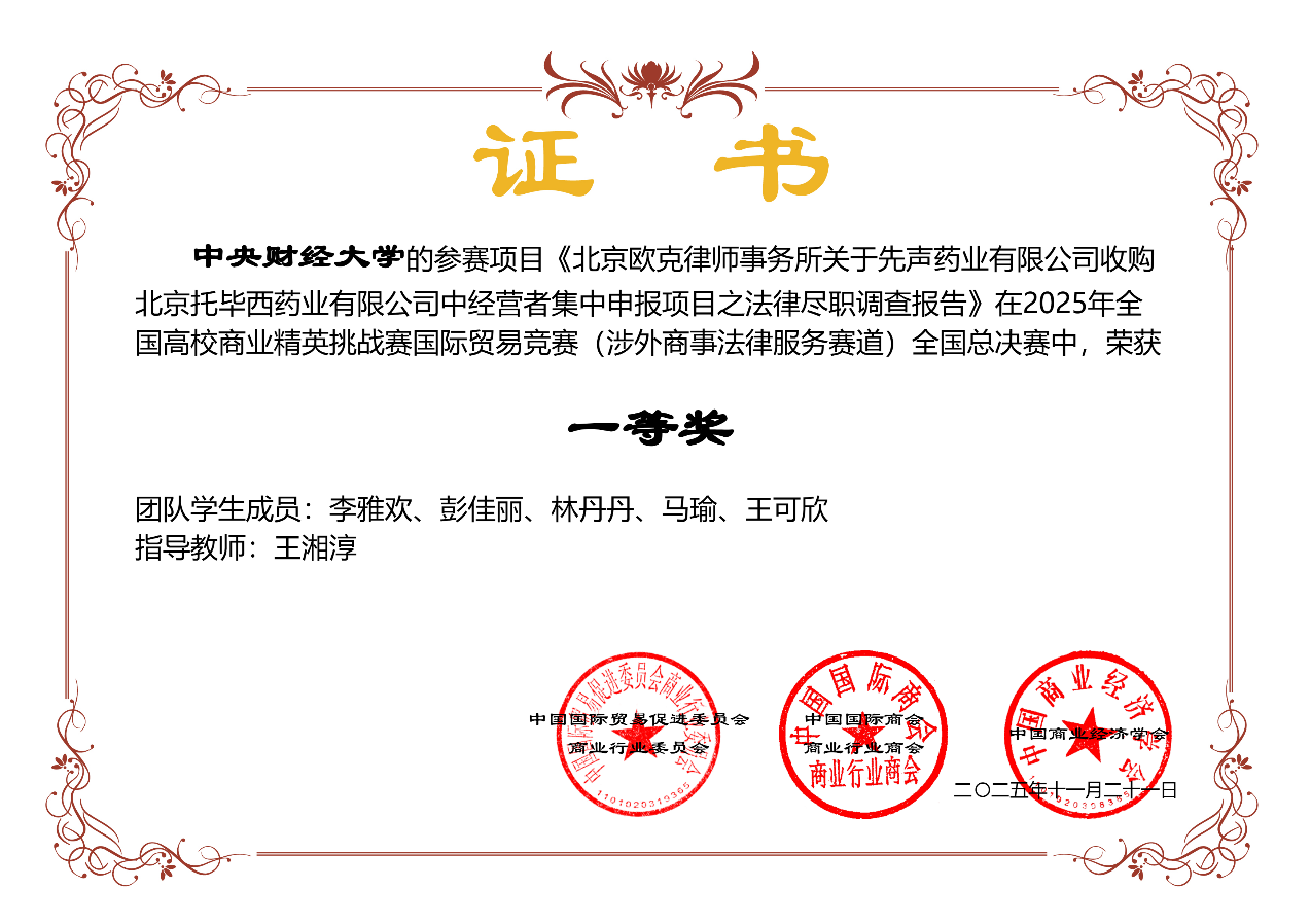 在学院教师指导下,学生广泛参与涉外类学科专业竞赛。2025年,获全国高校商业精英挑战赛国际贸易竞赛(涉外商事法律服务赛道)2项一等奖、1项二等奖以及1项三等奖,第十四届“中国WTO模拟法庭比赛”三等奖,第十七届法兰克福投资仲裁模拟法庭贸仲中国(内地)赛区预选赛循环赛最佳辩手等多个全国性重要涉外法治竞赛奖项。