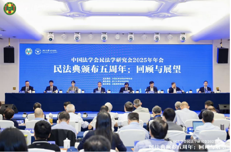 2025年10月18日至19日,中国法学会民法学研究会2025年年会在杭州召开。此次年会由中国法学会民法学研究会主办,浙江大学光华法学院承办,京衡律师事务所协办,来自全国民法学界的专家学者及法律实务部门人士500多人参会,会议研讨主题是“民法典颁布五周年:回顾与展望”。中国法学会党组成员、副会长兼秘书长景汉朝,中国法学会副会长、中国法学会民法学研究会会长、中国人民大学一级教授王利明,中国法学会副会长、中国法学会民法学研究会副会长兼秘书长、中国人民公安大学党委副书记、校长王轶,浙江省高级人民法院党组成员、副院长蒋卫宇,浙江省人民检察院党组成员、副检察长孙颖,浙江省法学会党组成员、专职副会长许洁,京衡律师事务所创始合伙人、浙江省破产管理人协会会长、律师任一民,中国法学会民法学研究会常务理事、浙江大学党委常委、副校长周江洪等领导出席开幕式。我院朱晓峰教授、武腾教授、副院长殷秋实副教授、范佳慧讲师受邀参加本次年会。