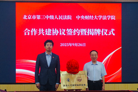 2025年9月26日,中央财经大学法学院与北京市第三中级人民法院举行法治人才协同培养基地合作共建协议签约暨揭牌仪式。北京市第三中级人民法院党组书记、院长薛春江,党组成员、政治部主任马骏,政治部副主任、干部处处长马斌,综合处处长张珂,研究室副主任王世洋,综合处三级调研员郭莹、办公室干部宋成;中央财经大学副校长栗峥,法学院院长尹飞、院党委书记于文豪、党委副书记徐颖、副院长刘权、副院长殷秋实、党委组织员陈诚,以及学院事务主管赵真、周游、刘泊宁,学院合作与发展办公室李紫仪等参加活动。