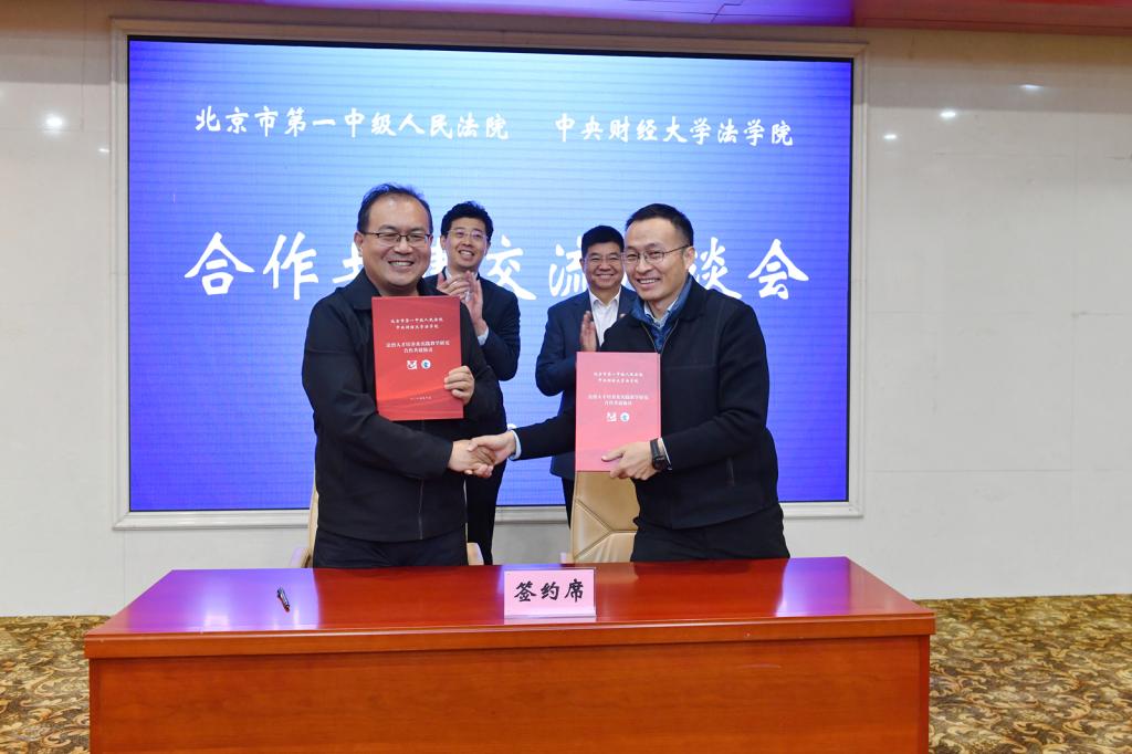2025年10月17日下午,中央财经大学法学院与北京市第一中级人民法院签订“法治人才培养及实践教学研究合作共建协议”并座谈交流。北京市第一中级人民法院党组书记、院长马强,党组成员、副院长李忠勇,教培处处长王文波,办公室主任杨磊,研究室副主任黄慧婧,执行一庭法官助理王一飞,清算与破产审判庭法官助理王小丹;我校副校长栗峥,法学院院长尹飞,院党委书记于文豪,党委副书记徐颖,党委组织员陈诚,院长助理刘泊宁及学院合作与发展办公室李紫仪参加活动。会议由李忠勇副院长主持。