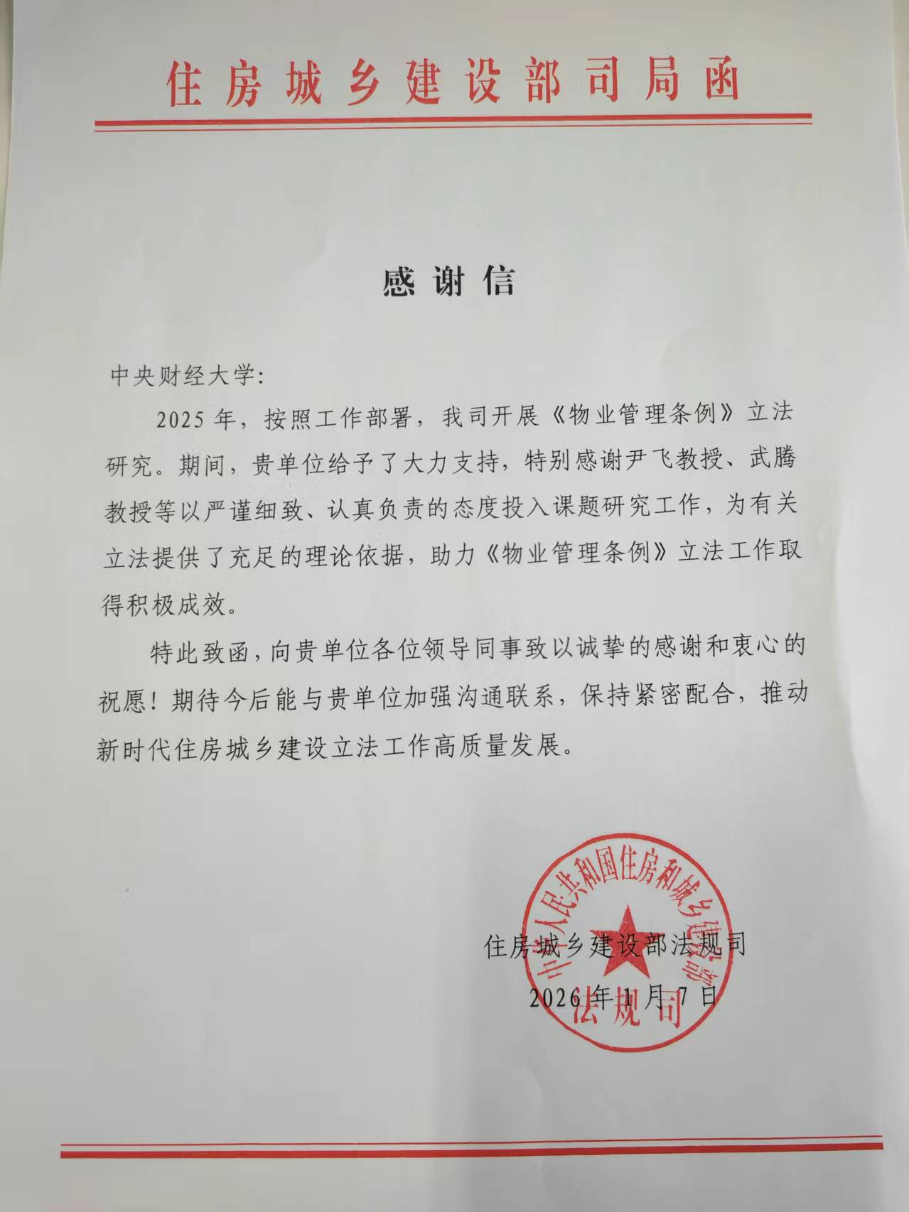 近日,住房城乡建设部法规司向我校发来感谢信,对我校在《物业管理条例》立法研究工作中给予的支持表示感谢。