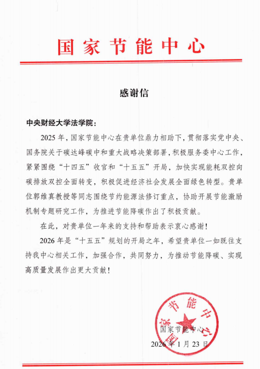 国家节能中心是经中编办批复成立、国家发展和改革委员会直属的事业单位。信中表示,我院在节约能源法修订立法研究工作中给予了大力支持,特别是郭维真副教授的专题研究工作,为有关立法提供了充足依据,为推进节能降碳作出了积极贡献。