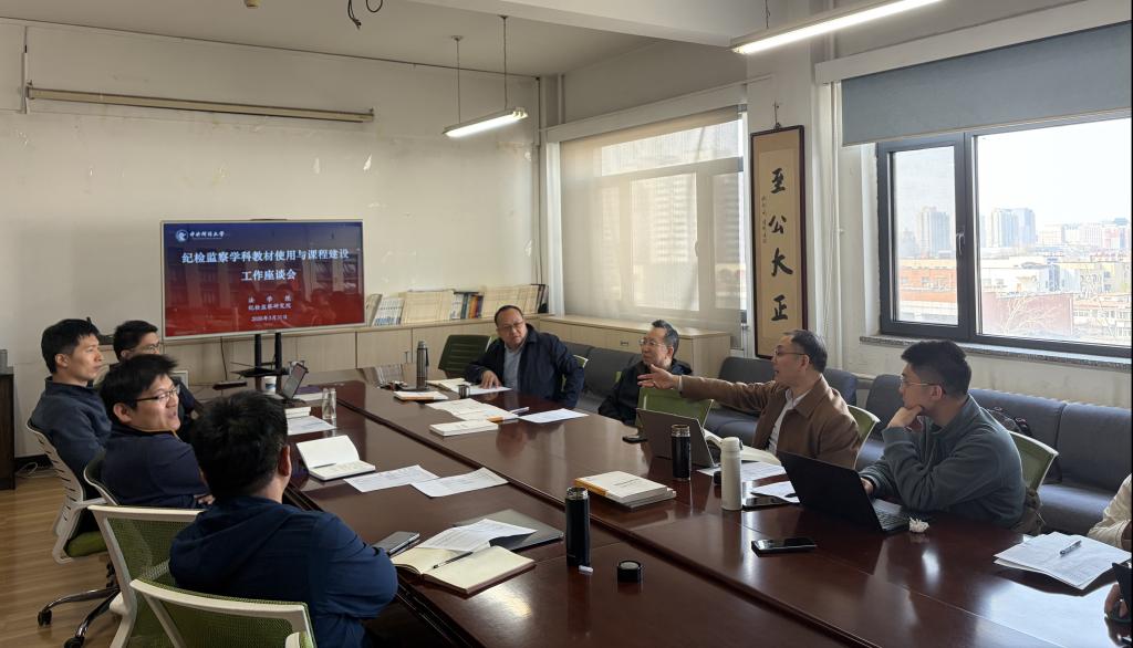 为扎实推进纪检监察学科建设和人才培养工作,2026年3月31日,中央财经大学法学院、纪检监察研究院举行“纪检监察学科教材使用与课程建设工作座谈会”。会议对中央纪委国家监委机关、教育部组织编写的9本纪检监察学科教材进行了交流学习,围绕纪检监察学科建设、培养方案、课程设计等议题展开研讨。院党委书记尹玉研究员、副院长殷秋实副教授、李邦友教授、艾茜教授、武腾教授、李朝晖副教授、赵真副教授、简爱副教授、周游副教授、张泽宇博士等参加座谈会。
